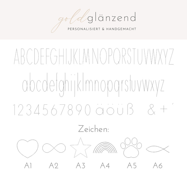 Graviert können max. 4 Zeichen, das können Buchstaben, Zeichen, Zahlen etc. sein. Eine Übersicht findest du auf dem 4. Foto.