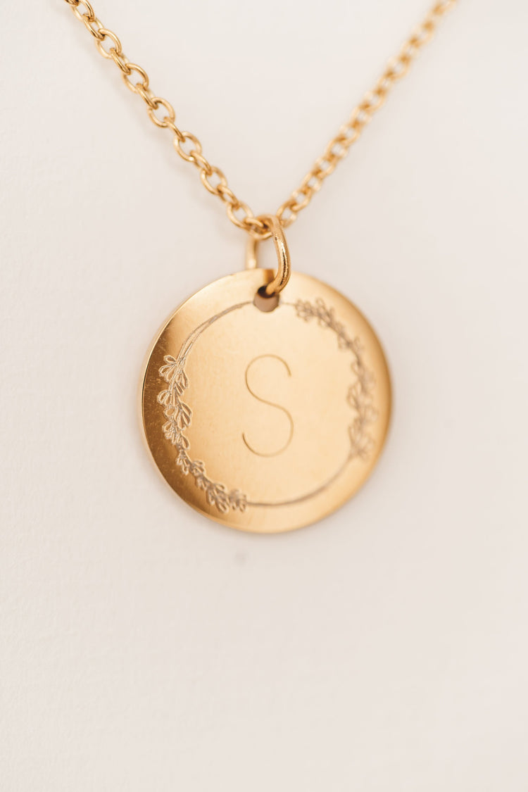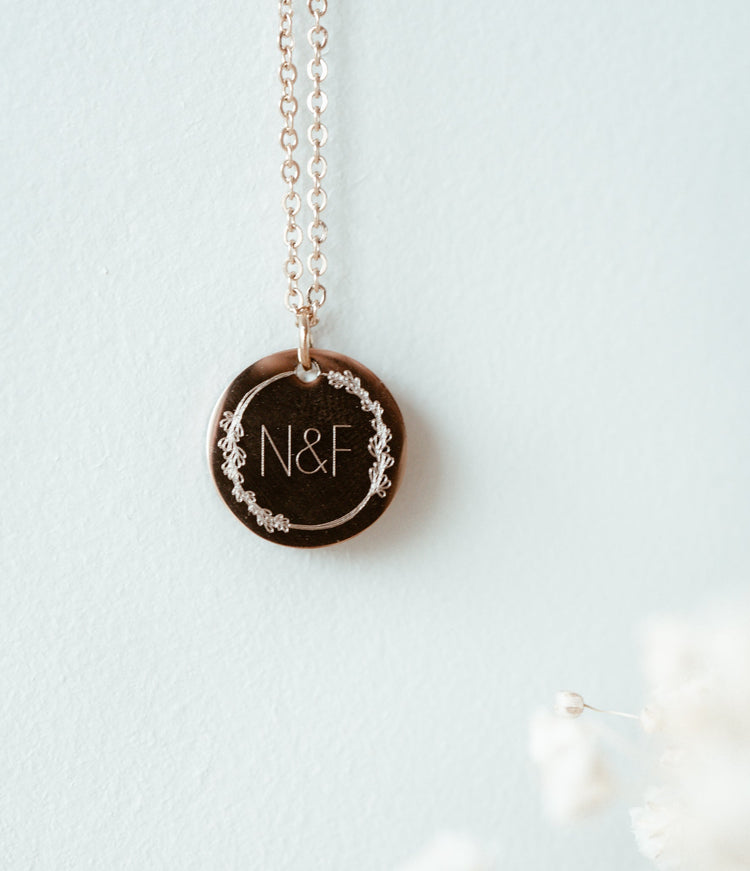 Wunderschöne Halskette mit einem Plättchen und einer Gravur mit einem floralen Kranz (von mir handgezeichnet).