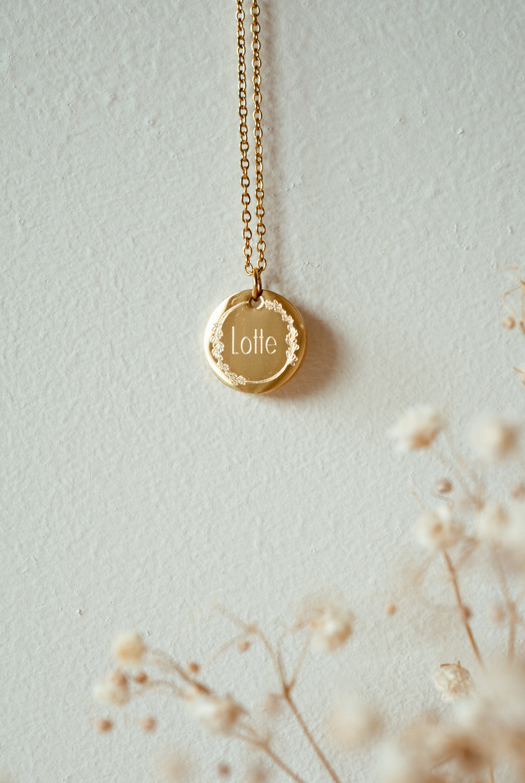 Halskette mit Gravur Gold Silber Rosegold mir floralen Kranz mit Blumen Kette mit Anhänger Personalisiert mit Namen graviert Geschenk